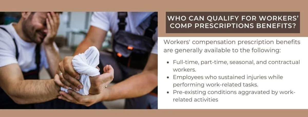 To qualify for work comp prescription benefits, your injury or illness must be directly related to your job. This means that injuries sustained while performing work-related tasks are usually covered.